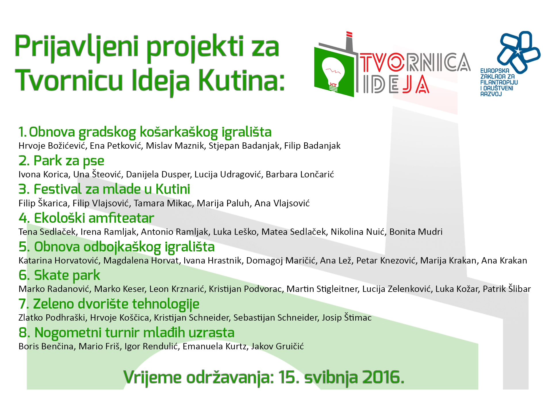 suda - osvojiti financijsku podršku u iznosu od 20.000 kuna. Najvažniji zahtjev koji se stavlja pred neformalne skupine mladih je da projekt kojega predlažu mora biti društveno-inovativan, održiv, originalan i društveno koristan.Sljedeća Tvornica ideja održava se idućega dana, u nedjelju 15. svibnja u Kutini. Na njoj se natječe čak osam neformalnih skupina mladih sa svojim projektnim prijedlozima.Sigurni smo da će biti i zabavno i poučno na obje Tvornice, a svim natjecateljima želimo puno sreće!