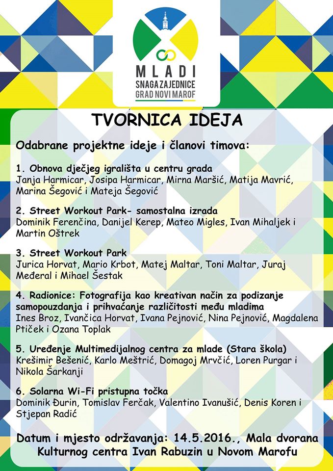Nakon prikupljenih projektnih ideja mladih u pet gradova sudionika u Programu "Mladi: snaga zajednice", prva po redu Tvornica ideja održat će se u subotu, 14. svibnja u Novom Marofu.Na novomarofskoj Tvornici ideja natjecat će se šest neformalnih skupina, od kojih će dvije - po stručnom mišljenju i odabiru ocjenjivačkog